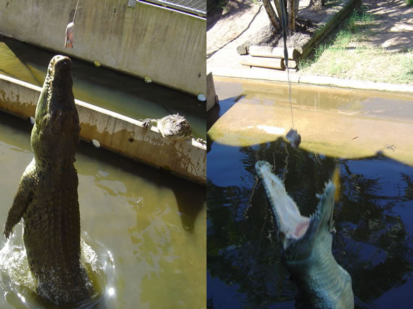 Darwin, Northern TerritoryWe watched some of the larger crocodiles being fed. They seem pretty expert at getting the food off the line. This demonstration showed how high they can jump and how fast they can move. Scary stuff. Previous | Album | Next |