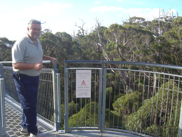 Tingle Forests, Denmark to Cosy CornerThe 600m walk is a gentle incline that makes its way through the red tingle forest canopy until it reaches the highest point at 40m from the ground. The walkways sway gently with the wind which makes it a little daunting for those who don't like heights. Previous | Album | Next |