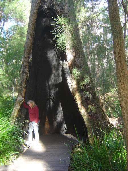 Tingle Forests, Denmark to Cosy CornerOver the life of the tree they survive many bushfires so many of them have burnt out buttresses at their base. The less exposed ones can make good homes or resting places for native animals. Previous | Album | Next |