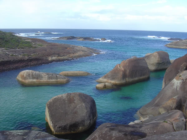 Tingle Forests, Denmark to Cosy CornerWe walked around to Elephant Rocks and Elephant Cove with its massive round boulders. You could see large fish swimming in the clear blue waters of the shallow cove. William Bay National Park has a stunning coastline. Previous | Album | Next |