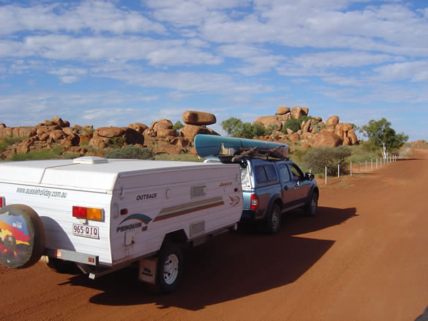Devils MarblesWe drove to the Three Ways then headed south to Tennant Creek. This is the best spot around here to fill up with petrol. We visited the Old Mine Information Centre which had lots of interesting information about the mining here and quite a good view of the area. We then headed further south to Devils Marbles National Park. Previous | Album | Next |