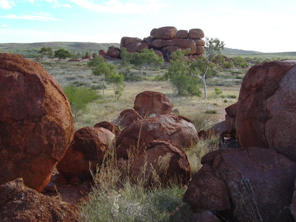 Devils MarblesThe landscape was dotted with these rounded rocks left behind after all the surrounding areas had eroded away. The boulders seemed to peel off parts of the outside layers. The Devils Marbles is an amazing landscape. Previous | Album | Next |