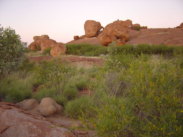 These are the rocks straight behind our campsite. As the sun rose next morning we noticed the rocks had changed colour again. That is Pete in a white shirt next to one of the 'marbles'.