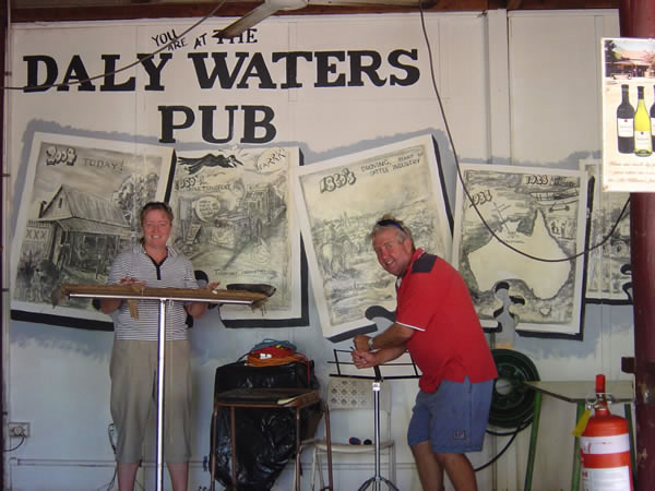 Daly WatersAn interesting stop is the Daly Waters Pub. They serve Croc and Barra Burgers and have nightly entertainment. It is a hit with the backpackers who leave memorabilia - anything from passport photos to g-strings in the pub wall display. Previous | Album | Next |