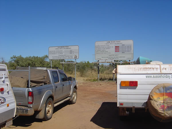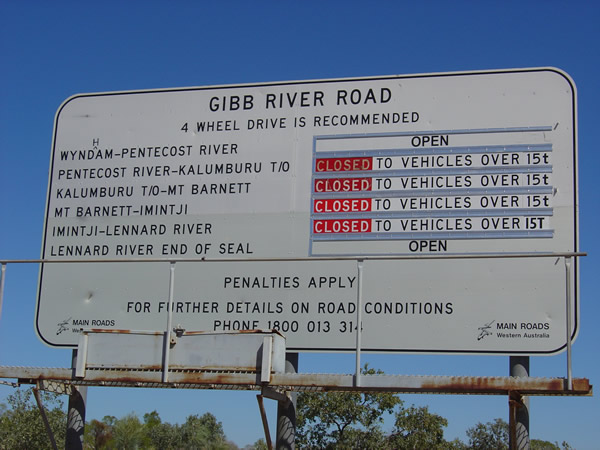 El Questro , Wilderness Park, Gibb River RoadThe road had not long been opened since the end of the 'wet season'. The main problem we would have to face was the Pentecost River crossing which we didn't have to worry about until after our visit to El Questro (see next album). We had heard the Gibb River Road up to El Questro was in pretty good condition ie a 2WD could manage it. Have a look at the sign up close. Previous | Album | Next |