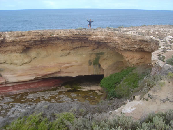 Eyre Peninsula, SAThe Tub looked like a large crater. Pete is standing on the other side of The Tub where part of the cave roof remains. The opening you can see under Pete goes right through to the ocean. How long will it be before more collapses? Previous | Album | Next |