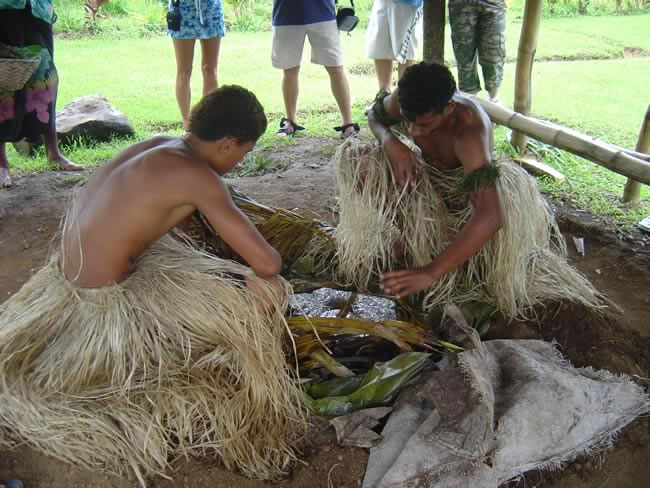 Fiji Holiday - Viti Levu IslandThey unearthed our meal, Lovu, which was a variety of meats and local vegetables cooked in the ground on hot rocks and covered in leaves. They added salads and served it as a buffet lunch. It was really good. Previous | Album | Next |