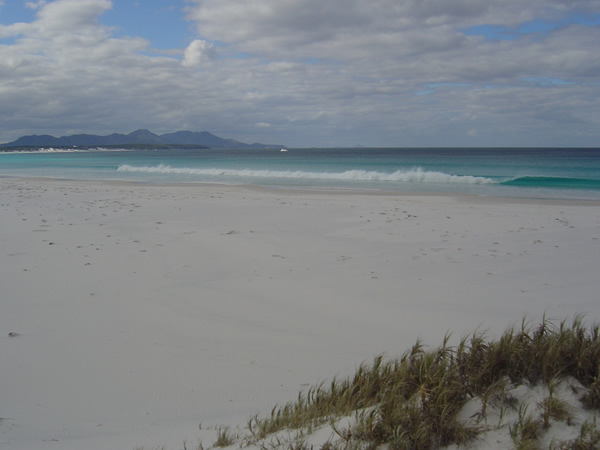 Point Ann, Fitzgerald River National ParkThis is the campsite at Point Ann in Fitzgerald National Park. Although they say it is not suitable for caravans we found the roads were in very good condition (although they were still dirt/gravel) and a number of the camp sites were 'drive through' which suited small caravans like ours. Can you see the whale jumping in the bay in the background behind Pete? Have a look at the bay up closer to see the whale after it has splashed back into the water. Previous | Album | Next |