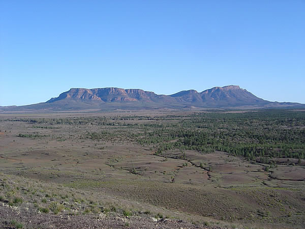 Flinders Ranges National ParkWe drove up to the top of Pugilist Hill which gave us a great view of Wilpena Pound. You can see the dish-like shape formed when pressure pushing in from each side caused movements of the earth's crust to form a trough (geosyncline). The layers of rocks are bent up at each side with a depression in the middle. Previous | Album | Next |