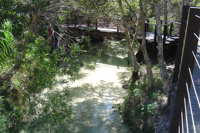 Fraser Island, Queensland 2005We stopped for a break at Eli Creek - last toilets. A lot of the damage from the storms last year has been repaired but the board walk is still closed off on one side. This is a shame as it used to be a lovely walk along the crystal clear creek. It is hard to see the water in the photo below it is so clear. Previous | Album | Next |