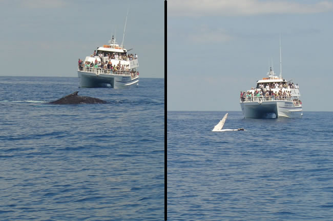 Fraser Island, Queensland 2005We went out in the power boat to get a closer look at the whales. You can't motor up closer than 100m to the whale but if you are lucky you can guess which way they are heading and place your boat strategically, cut the engines and then hope they continue to swim toward you. They are VERY used to whale watching tours and usually perform quite well for the tour boats. Previous | Album | Next |
