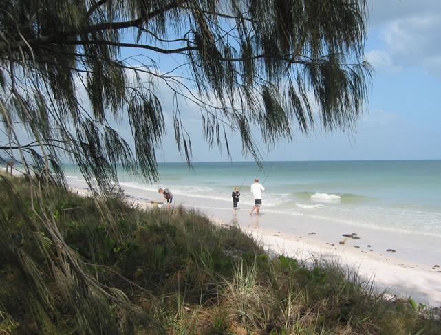 Fraser Island - QueenslandWhen the tide is in you can see why 4WDs can't drive on this beach. This is one of the reasons we like the calm side of the island rather than the more popular surf side. The kids are safe to run on the beach without fear of being hit by a 4WD. We caught a few small whiting while fishing today. Previous | Album | Next |