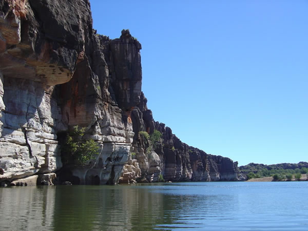 Geike Gorge, The KimberleysSome of these sections of rock looked like they were about to fall into the river! Once we got past this West Wall section of the Gorge we would be about half way through the tour zone. We had been paddling slowly for nearly an hour enjoying the scenery so should make it to the recreation zone in the allotted 2 hours without any trouble. Previous | Album | Next |