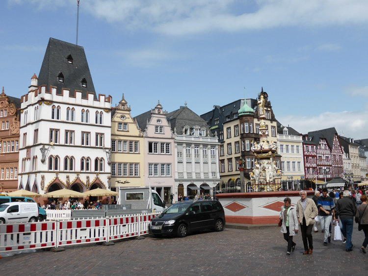 UK and Europe Roadtrip - Trier Market SquareThe main Market Square (Hauptmarkt) in Trier is not far from the Cathedral. It is surrounded by beautiful traditional German buildings. This is the place to buy flowers, fruit and vegetables or come for a coffee or lunch. Select the photo below to see more of St Peters Fountain. Previous | Album | Next |