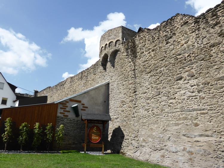 UK and Europe Roadtrip - RhensRhens is part of the UNESCO World Heritage region 'Upper Middle Rhine Valley'. The city wall is around 8m high, well preserved and was built in a pentagon shape. This winery was built backing onto the old Rhens city fortifications. Select the photo below to see an old wine press on display here. Previous | Album | Next |