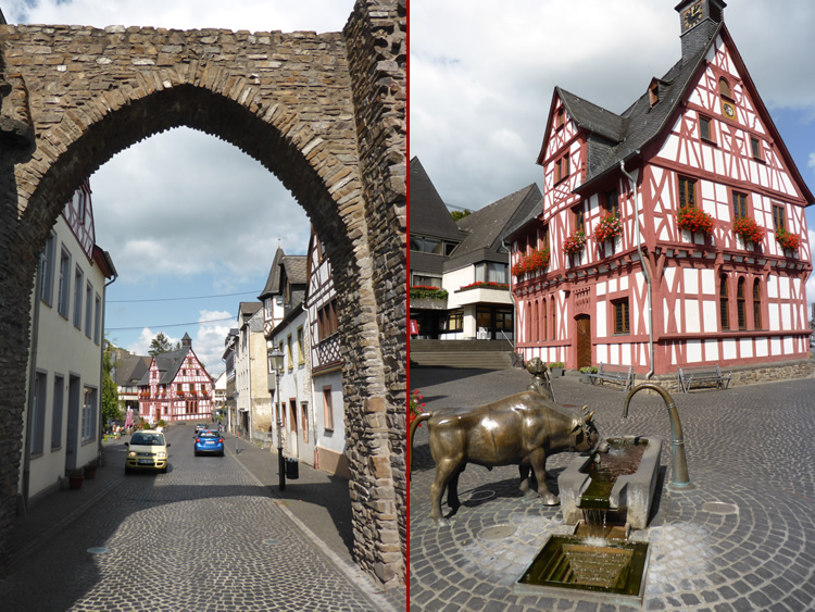 UK and Europe Roadtrip - RhensWe walked through the Church Gate, built around 1400. The tower that once adjoined it was blown up in 1689 by French troops. Down this cobbled lane is Rhen's historic market square with a beautiful red timbered Town Hall and a bronze statue of a boy and his cow at an old cattle trough. Select the photo below to see the market square. Previous | Album | Next |