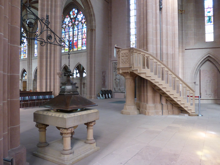 UK and Europe Roadtrip - OppenheimHere you can see the stone staircase leading to St Catherine's Cathedral pulpit and nearby the baptismal font. Somehow we missed the ossuary in St Michael's Chapel at the rear of the cathedral. It houses the bones of around 20000 citizens of Oppenheim from previous centuries. Select the photo below to see more of the memorials found around the walls of the cathedral. Previous | Album | Next |