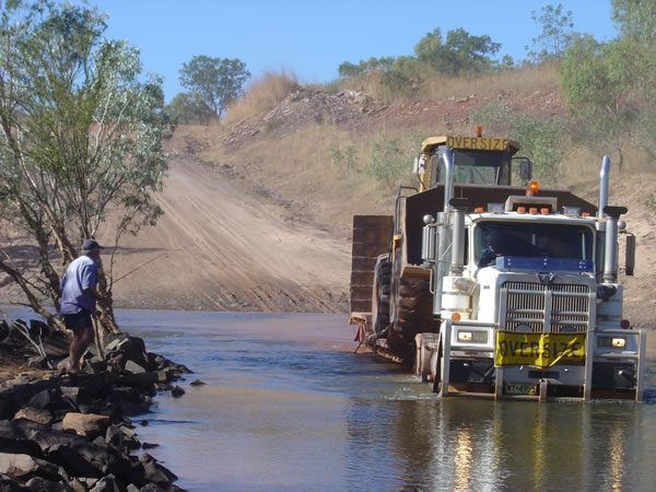 Gibb River Road to King Edward RiverThe next river crossing was the Durack River. After the Pentecost this was nothing to worry about. We stopped for lunch on the other side and Pete & Gary went back down to try some fishing. You had to be careful of crocodiles of course - AND big trucks! Previous | Album | Next |