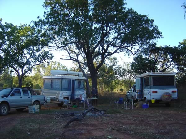 Gibb River Road to King Edward RiverThere are a few bush camps (rest areas) along the Gibb which allow camping. It is nice to have a few 'freebies'. Of course Gary managed to find a (large) dead tree to use for firewood. It was enough to cook a roast in the camp oven, heat the washup water and have enough next morning to cook bacon & eggs for breakfast. We made sure it was well and truly out before we left though. Previous | Album | Next |