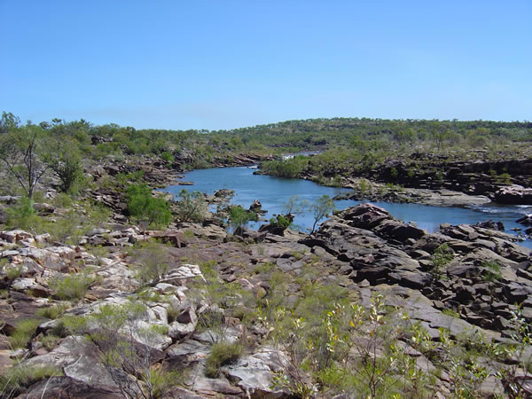 Mitchell Plateau (Ngauwudu) National ParkThe track markers become a lot more difficult to spot as you reach the rockier areas along the Mitchell River near the top of the falls. If you get off the track you have to deal with the sharp needles of the spinafex so it is better to search for the elusive track markers. The white water you see up the river towards the centre of the photo is where we cross (see next photo). Previous | Album | Next |