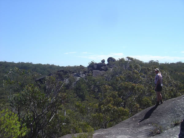 Gibraltar Ranges National Park, NSWYou get a good view in all directions from the top. We could see large granite boulders, stringybarks and grass trees everywhere. You need to take care to not slip off the edge of these curved boulders. It wouldn't be good to be up here in the rain. Previous | Album | Next |