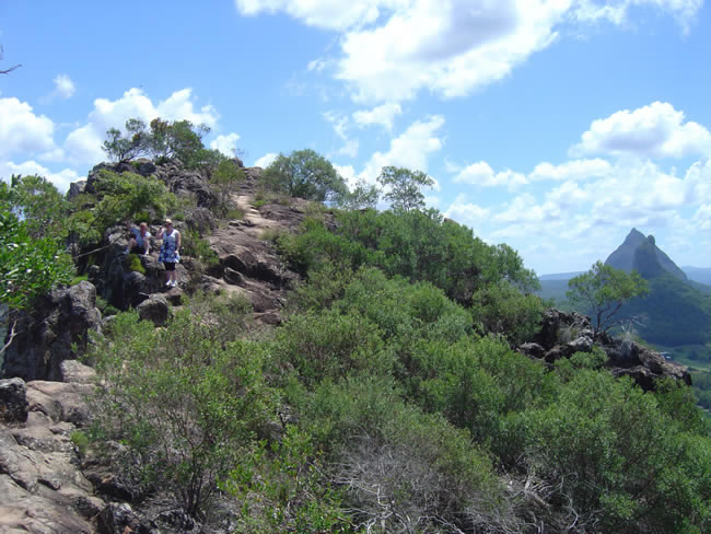 Glasshouse Mountains - Mt NgungunWe made it and yes the view is spectacular. This narrow ridge runs along the top of Mt Ngungun falling away very sharply on the carpark side. This is where we saw the walkers standing from the carpark below. Previous | Album | Next |
