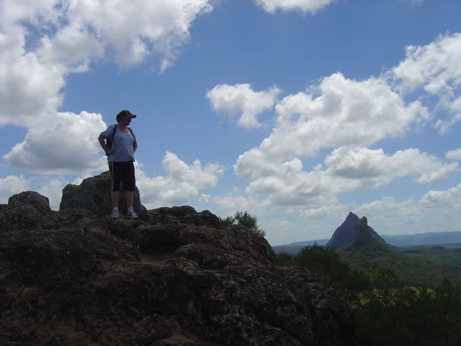Glasshouse Mountains - Mt NgungunThe highest point gave you a great view of Coonowrin (377 metres foreground) and Mount Beerwah which is the highest peak, at 555 metres (background). If I stepped back a couple of metres here I would be falling down a cliff face. Previous | Album | Next |
