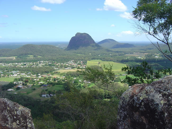 Glasshouse Mountains - Mt NgungunThe view from the top to Tibrogargan (which is 364 m high). According to Aboriginal legend Tibrogargan was the father and Beerwah (at 555 m the highest of all the peaks) the mother. They had a number of children of whom Coonowrin (377 m - the narrow and most dramatic of all the volcanic plugs) was the eldest, Tunbubudla were the twins (293 m and 312 m), Coochin (235 m), Ngungun (253 m), Tibberoowuccum (220 m), Miketeebumulgrai (199 m) and Elimbah (129 m). The Glass House Mountains area was a special meeting place where many Aboriginal people gathered for ceremonies and trading. This place is considered spiritually significant with many ceremonial sites still present and protected today. Previous | Album | Next |
