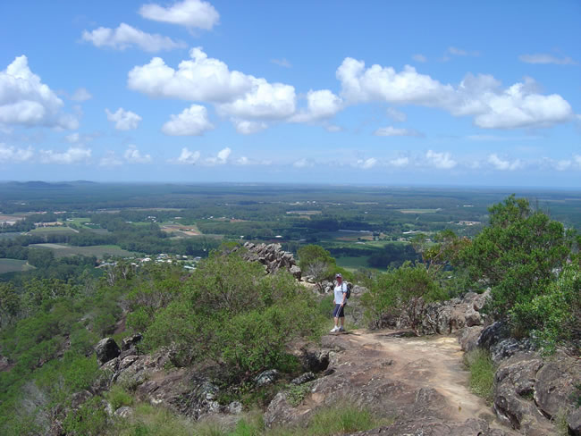 Glasshouse Mountains - Mt NgungunLooking along the ridge you can see all the way to the coast and Bribie Island. We would be looking right across the campo at Coochin Creek. Looking at the winding waterway we realise why we didn't make it to Pumicestone passge in the canoe. As the 'crow flies' it is not far but with all the bends and turns it is a very long paddle. Previous | Album | Next |