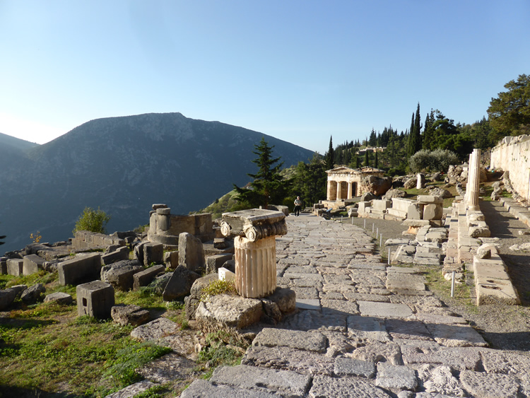 UK and Europe Roadtrip - Delphi AcropolisWe passed The Halos, a round open space where ancient rituals would be performed. Presumably someone has translated the many engraved stones we saw. The Maxims of the 7 Sages were engraved near Apollo's Temple:- 'know thyself' and 'nothing in excess'. Wise words! Select the photo below to see more. Previous | Album | Next |