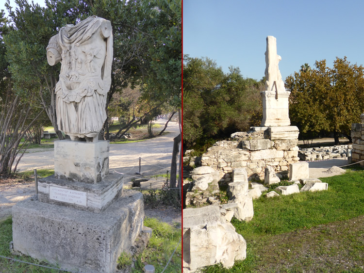 UK and Europe Roadtrip - AthensSome of the statues have plaques to identify them, many do not. What remains of the Statue of Emporer Hadrian, 117 - 138 AD, is on the left. Select the photo below to see the well-preserved Temple Hephaestus, with its impressive doric columns, on the hill above us. Previous | Album | Next |