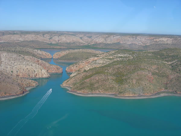 Horizontal Falls and DerbyThere are saltwater crocodiles in these waters. So even though it is a beautiful enticing blue colour you wouldn't swim in these bays. The speedboat in this photo is heading through the gaps in the ridges. It is in these gaps that the horizontal falls will later form when the tide changes. Previous | Album | Next |