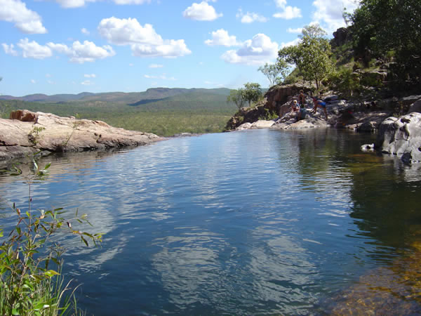 Kakadu World Heritage National ParkThe water in the last pool just seems to drop over the edge - there is a rock wall just there before it drops so although it looks terribly dangerous you won't wash over the falls. The view from here is brilliant! Previous | Album | Next |