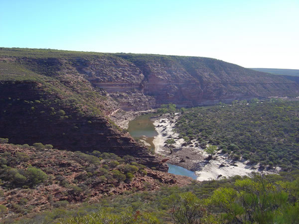 Kalbarri National Park and Coastal GorgesSeveral lookouts are positioned around The Loop to give you different perspectives on the switchback course of the Murchison River. We spotted what we thought was a Peregrine Falcon hunting its prey along the cliffs. Previous | Album | Next |