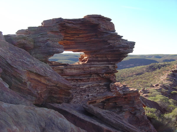 Kalbarri National Park and Coastal GorgesThe same view of the Murchison (from the previous photo) can be seen through 'Natures Window'. This natural rock arch superbly frames the upstream view. Have a look at Nature's Window from the other side. Previous | Album | Next |