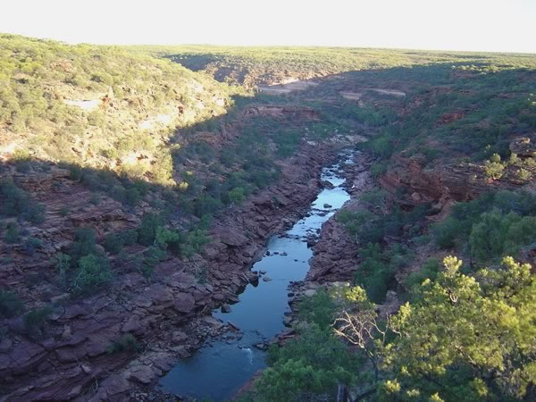 Kalbarri National Park and Coastal GorgesAt the lookout, the gorge at Z-Bend plunges 150m to the river below. We were late getting here so it was getting dark but still the scenery is impressive. This is looking south up one arm of the Z-Bend. Previous | Album | Next |