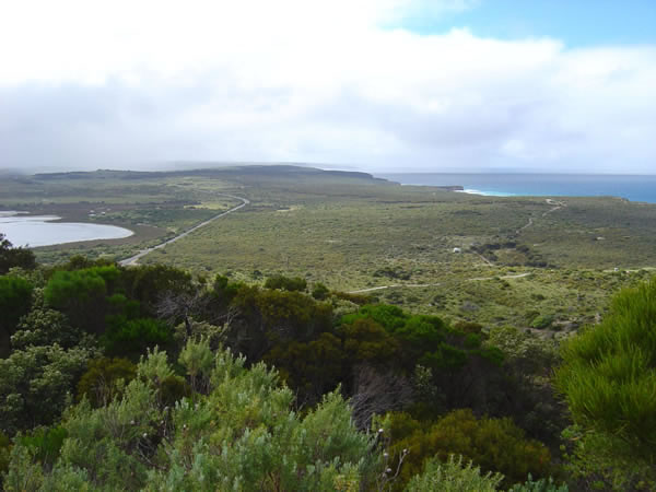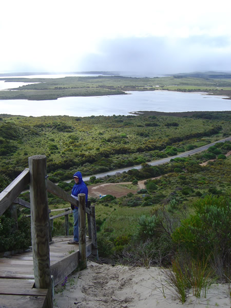 Kangaroo Island, South AustraliaFrom the car park there are about 550 steps up to this lookout on Prospect Hill. We know because Pete counted them! It sits above a very narrow strip of land joining Dudley Peninsula to the rest of Kangaroo Island. It was climbed by Captain Matthew Flinders and used to survey the Island in the very early 1800s. It has views of Pelican Lagoon, Pennington Bay and the Southern Ocean. Previous | Album | Next |