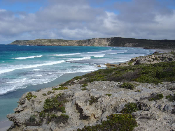Kangaroo Island, South AustraliaWe drove down to Pennington Bay for a closer look. It is known as a surf beach but can be quite dangerous. From the signs it seems that fishing might also be good in this bay. You can see by the eroded rocks and cliffs that in rough weather the gale force southerly winds cause huge crashing waves. Previous | Album | Next |