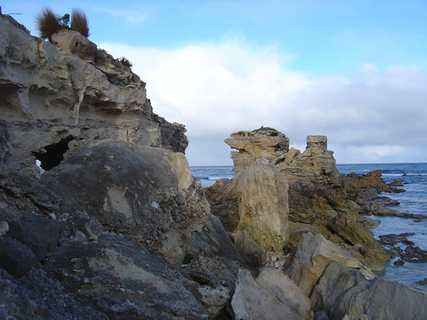 Kangaroo Island, South AustraliaFrom Cape Gantheaume Wilderness and Conservation Park, we drove slowly back calling in at various beaches deciding where to camp the night. We walked to the end of Wreckers Beach and saw an osprey in its nest on top of the unusual rock formations you see here in the distance. Previous | Album | Next |