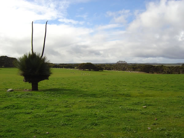 Kangaroo Island, South AustraliaWe headed back inland across beautiful green farmlands dotted with white sheep and amazingly tall grass trees. Tates Grass Tree or Yakka Trees are very slow growing - a metre every hundred years. This one was unusual with two tall stalks where normally it would have one. The gum from the Yakka was once used to make fireworks, flares and waterproofing but the tree was almost wiped out so is not harvested any more. Now you know where the term 'hard yakka' came from as the harvesting of the gum was a lot of hard work! Previous | Album | Next |