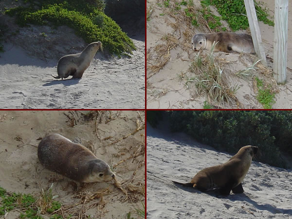 Kangaroo Island, South AustraliaAustralian sea-lions belong to the same seal family as fur-seals. They differ from 'true' seals by having external ears, propelling themselves through the water with their front flippers and are more agile on land (as they are capable of "walking" on all four flippers). Previous | Album | Next |