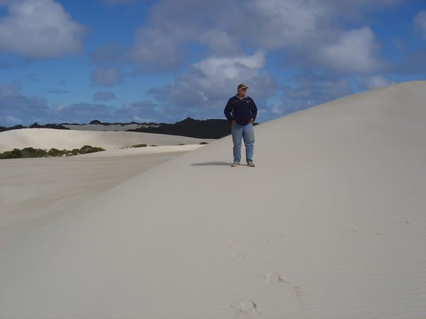 Kangaroo Island, South AustraliaWe followed the South Coast Road and stopped at Little Sahara, an area of spectacular white sand dunes. We climbed to the top of the first dune and saw that there was sand dune after sand dune surrounded by bushland. Previous | Album | Next |