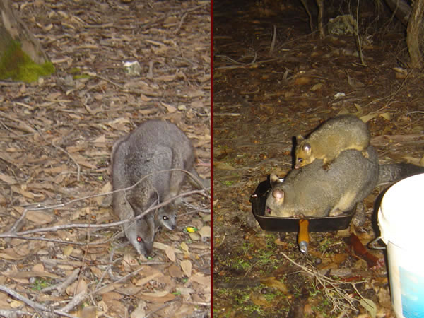 Kangaroo Island, South AustraliaWe had a wallaby and its joey visit us during the day and a possum with its young stopping by to clean up our cooking utensils at night. There was plenty of wildlife to see but we were the only campers here. The main campground at Flinders Chase had flushing toilets, solar heated showers and camp kitchens but the smaller campgrounds like this one had water tanks and pit toilets only. Previous | Album | Next |