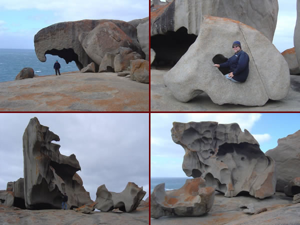 Kangaroo Island, South AustraliaRemarkable Rocks was...remarkable! More than 500 million years ago a dome of molten rock oozed up through the layers of sedimentary rock and hardened. For the last 200 million years this dome has been eroded by waves, when the sea level was higher, and subsequently sea spray and wind to what you see here today. Previous | Album | Next |