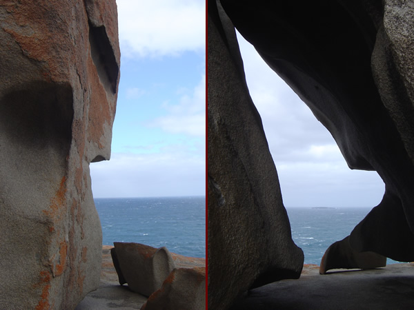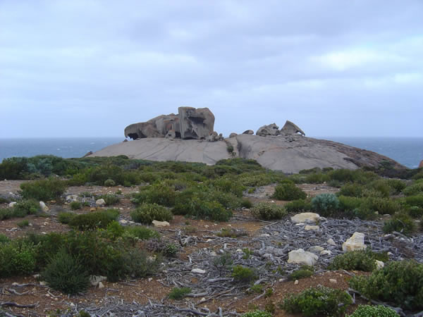 Kangaroo Island, South AustraliaHere you can see the naturally sculptured Remarkable Rocks formation lying on top of the remnant granite outcrop right on the edge of the ocean. The wind was so strong on the far side that you had to be careful not to get blown into the ocean - seriously! Have a look at the more unusual formations up closer. Previous | Album | Next |