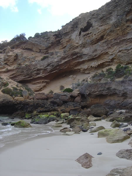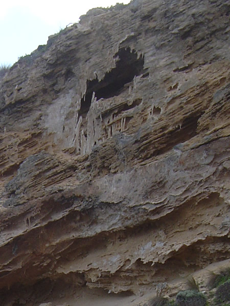 Kangaroo Island, South AustraliaThe cliffs along West Beach were really interesting to look at. The hole eroded into this cliff face could be the entrance to a cave if the water keeps gouging it out each high tide. Have a look at it up closer. Previous | Album | Next |