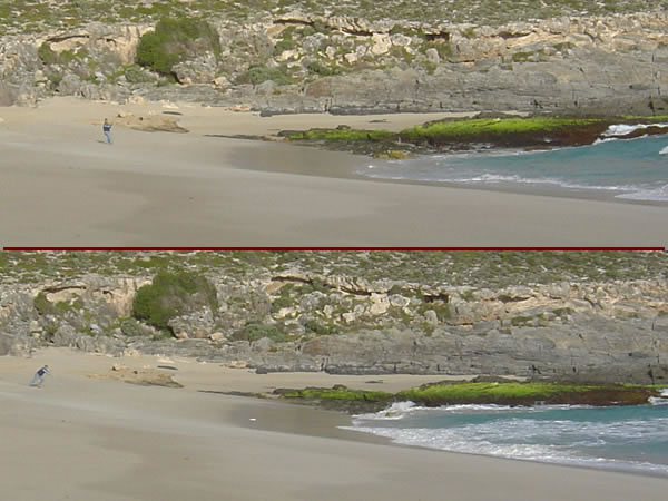 Kangaroo Island, South AustraliaAs you can see in the top photo he is just dragging the salmon in out of the water then pulling it up the beach. It is a really big fish - I am thinking of dinner... The second photo shows the tragedy as it got off the line and Pete wasn't quite quick enough to grab it before a wave washed in and dragged it back to sea. Previous | Album | Next |
