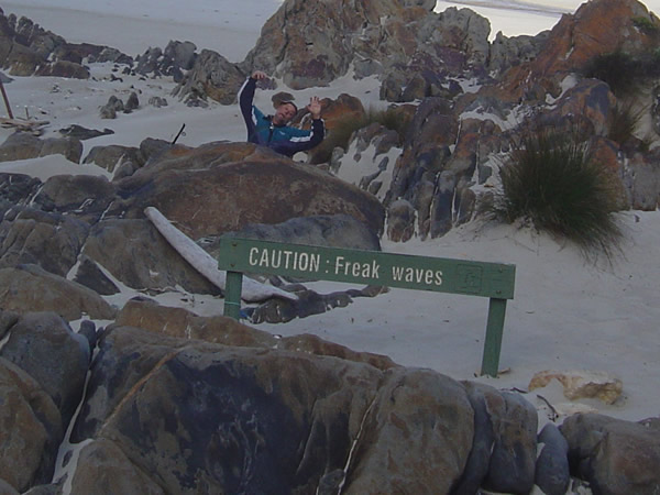 Kangaroo Island, South AustraliaI was busy exploring cliffs and caves on our walk to the bay so fell behind a bit. Pete seemed to disappear before I finally caught up to him until I got closer and he popped up from behind this sign. We all know who the 'freak' is! Previous | Album | Next |
