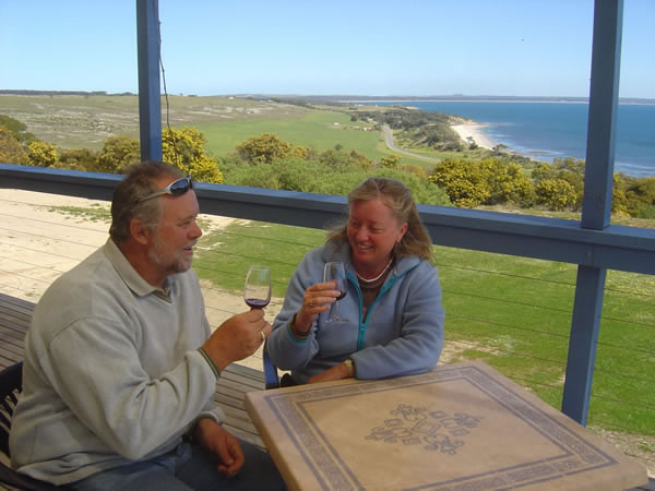 Kangaroo Island, South AustraliaWe skirted along the coastal road catching glimpses of Investigator Strait. We stopped at Emu Bay and American River before settling in for a bit of wine tasting at Sunset Winery. What a great view and great wine as well! Previous | Album | Next |