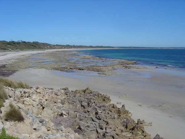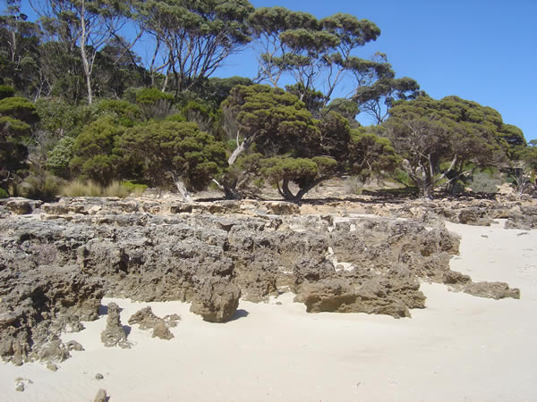 Kangaroo Island, South AustraliaIt was low tide by the time we got to Browns Beach. We had lunch then went for a walk and took a few photos along the way. Have a look at the unusual limestone rocks with stunted trees growing out of them. Previous | Album | Next |